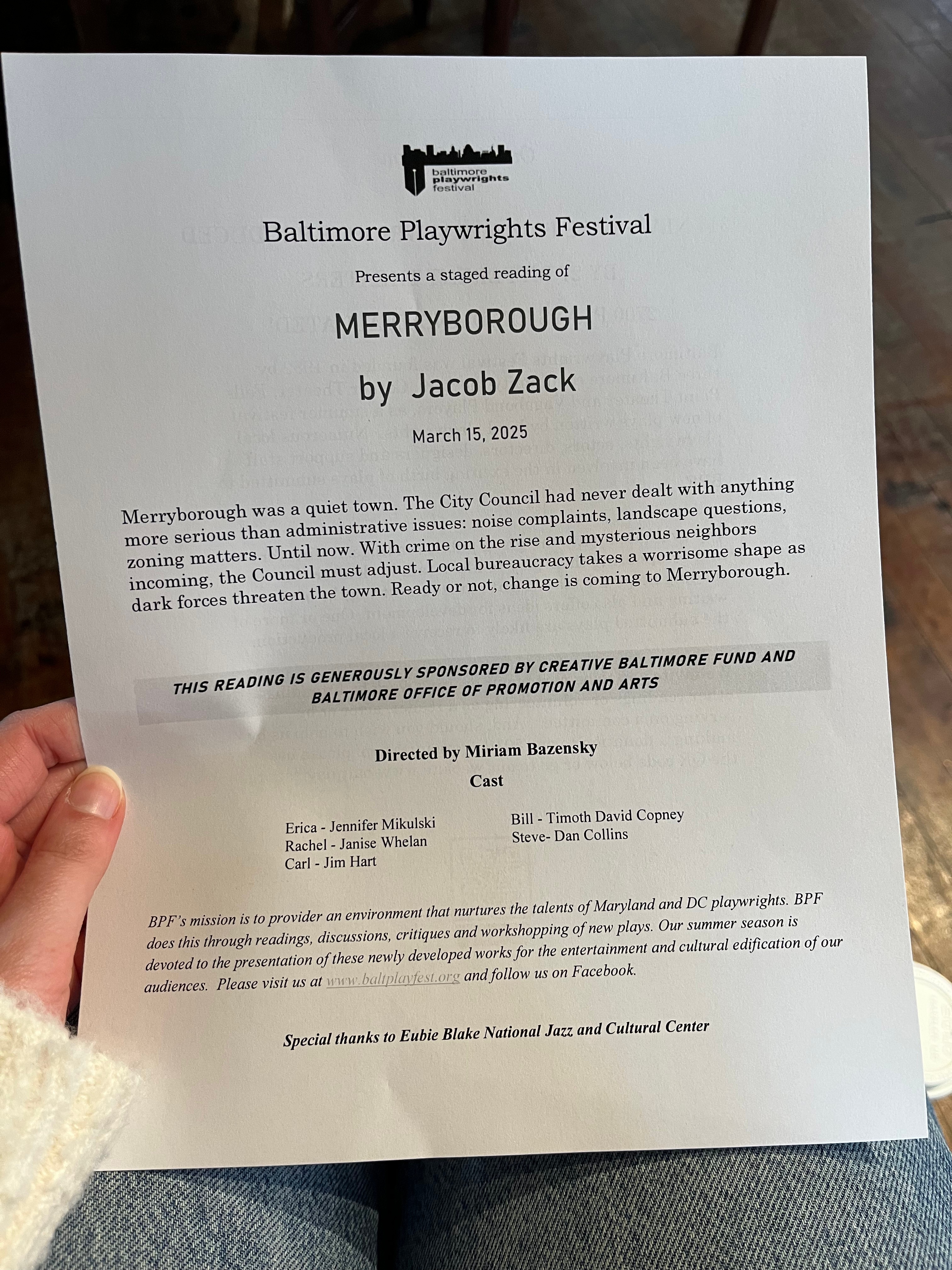 Thank you to the Baltimore Playwrights Festival for supporting new work and to everyone who joined the reading – more updates as this play continues its journey!